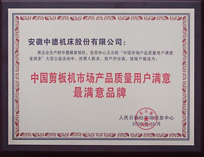 由人民日报社市场信息中心主办 樱花视频网站,中国物流与采购联合会,中国纺织工业协会,中国轻工机械协会等60多家权威行业协会,《工人日报》,《科技日报》等10家权威报刊,人民网及搜狐网等权威网站协办支持,为期三个多月的“中国市场质量用户满意度调查”大型公益活动终于揭晓,我公司生产的中德牌剪板机,在本次公益活动中,投票人数多,用户评分高,被用户推选为:中国剪板机市场产品质量用户满意最满意品牌。