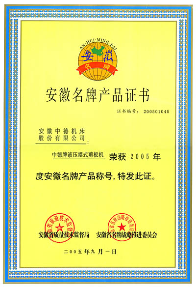 “中德牌”剪板机荣获2005年“安徽名牌产品”称号 (樱花视频免费观看)