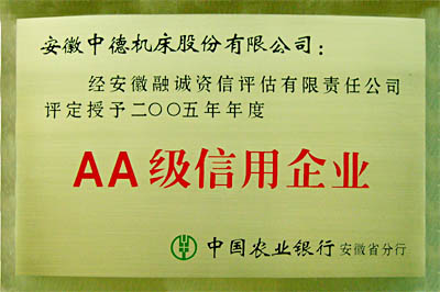 日前,经安徽融诚资信评估有限责任公司评定 樱花视频网站,安徽中德机床股份有限公司再次被中国农业银行安徽省分行授予二00五年年级AA级信用企业。